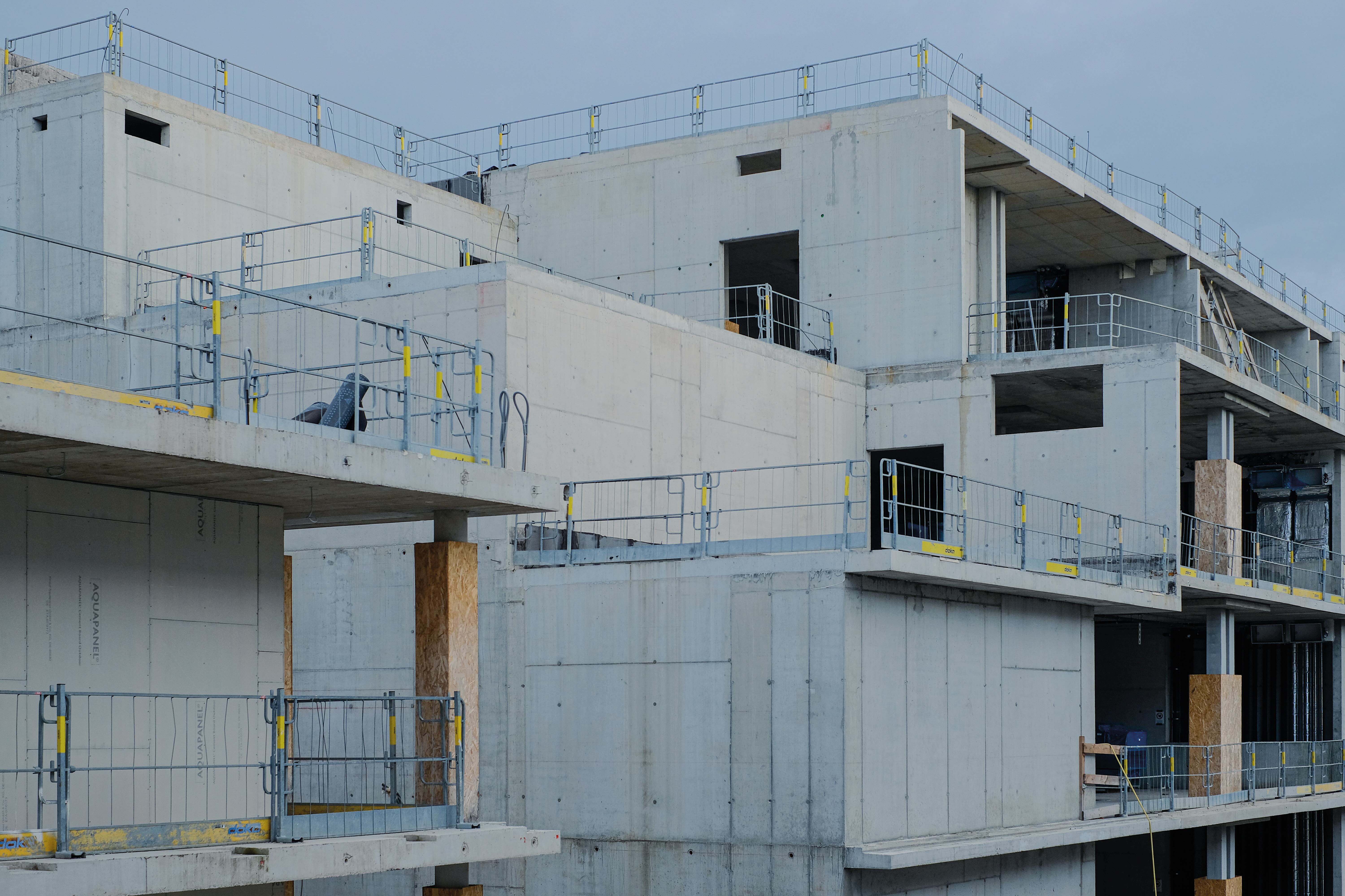 To make the construction site safely accessible for public use, railings must be installed. These are essential for the safe utilization of the space by the community and are also intended to serve as a subtle yet colorful element, providing a contrast to the building.
