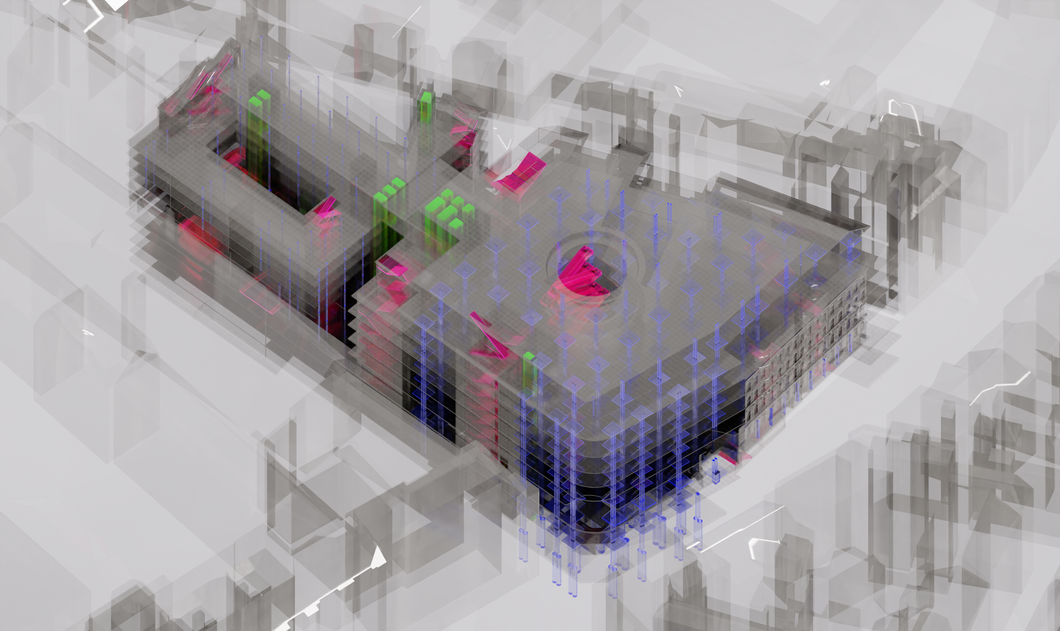 The 35,000 m² of above-ground shell construction span six floors. They are divided into two building structures with varying ceiling heights. The hotel structure features lower ceiling heights and relatively less generous open space. However, the atrium provides more natural light on the floors.