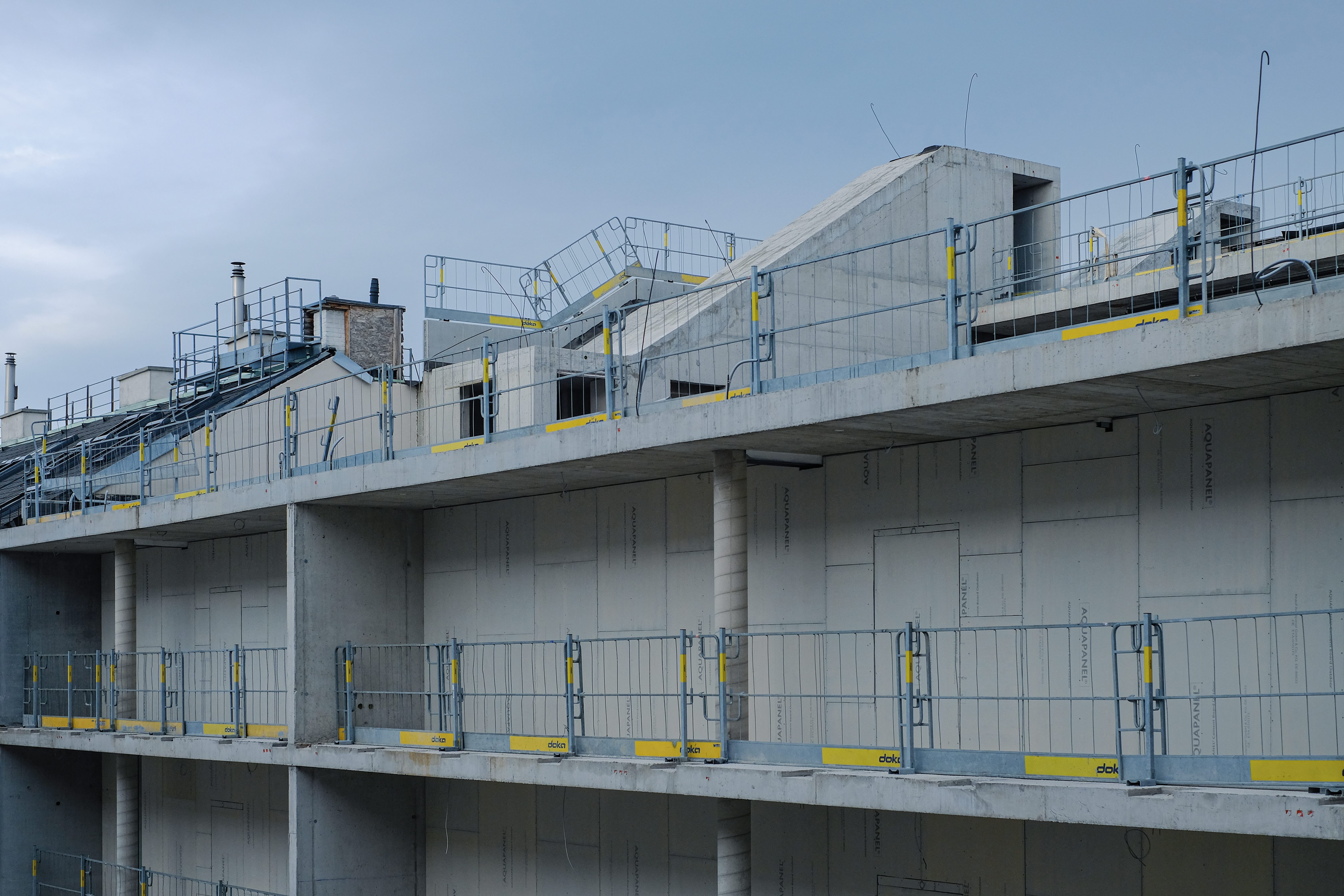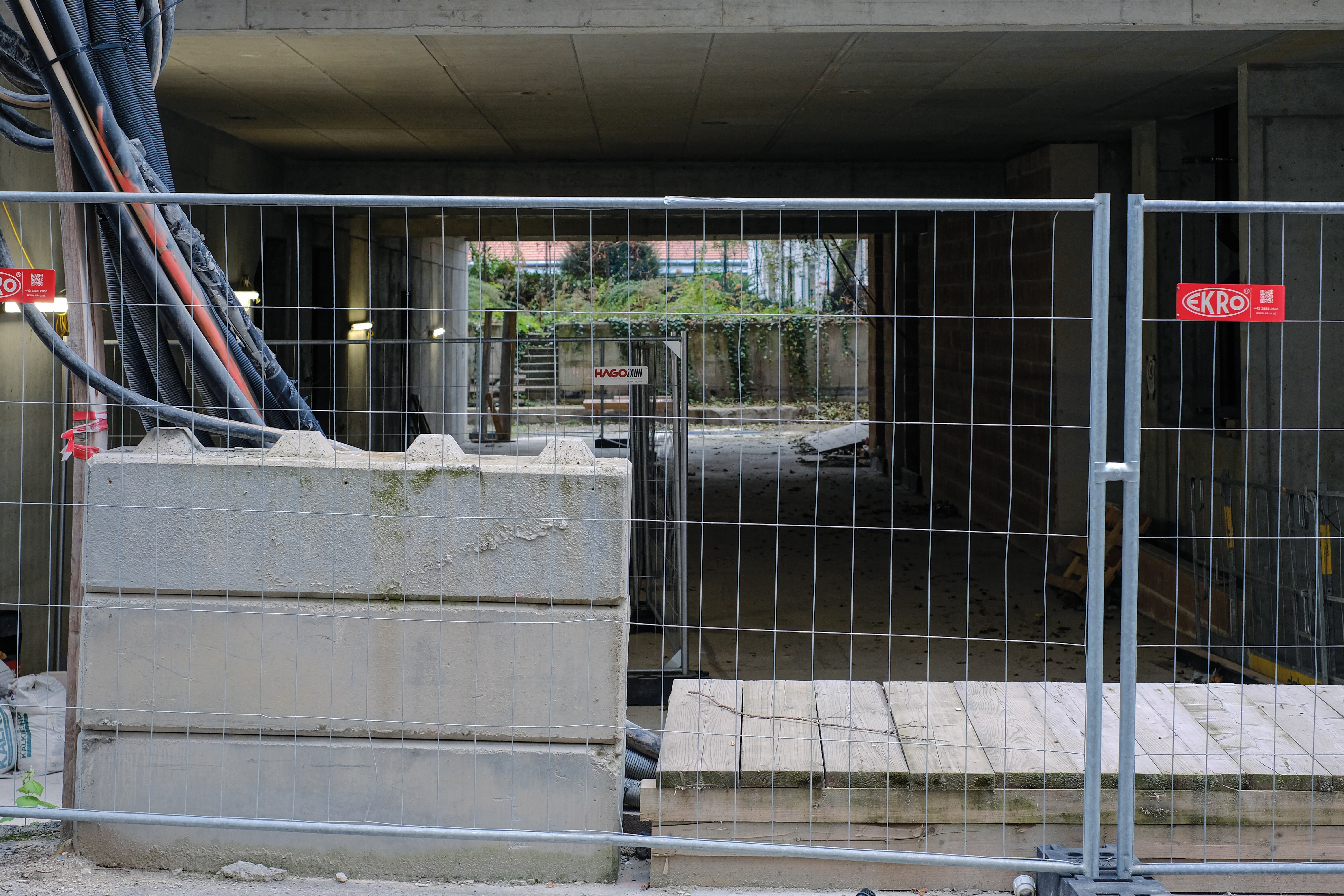 To make the construction site safely accessible for public use, railings must be installed. These are essential for the safe utilization of the space by the community and are also intended to serve as a subtle yet colorful element, providing a contrast to the building.